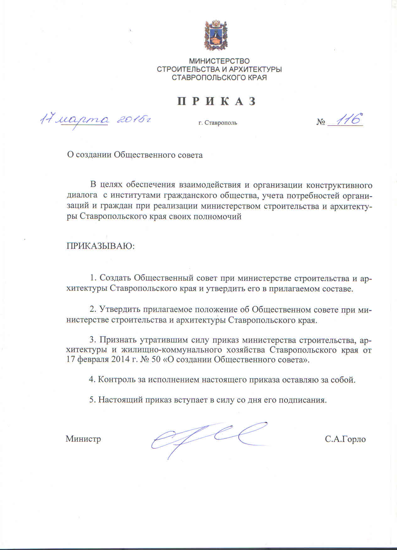 • Приказ министерства строительства и архитектуры Ставропольского края от 17 марта 2015 года № 116 "О создании Общественного совета"  скачать
