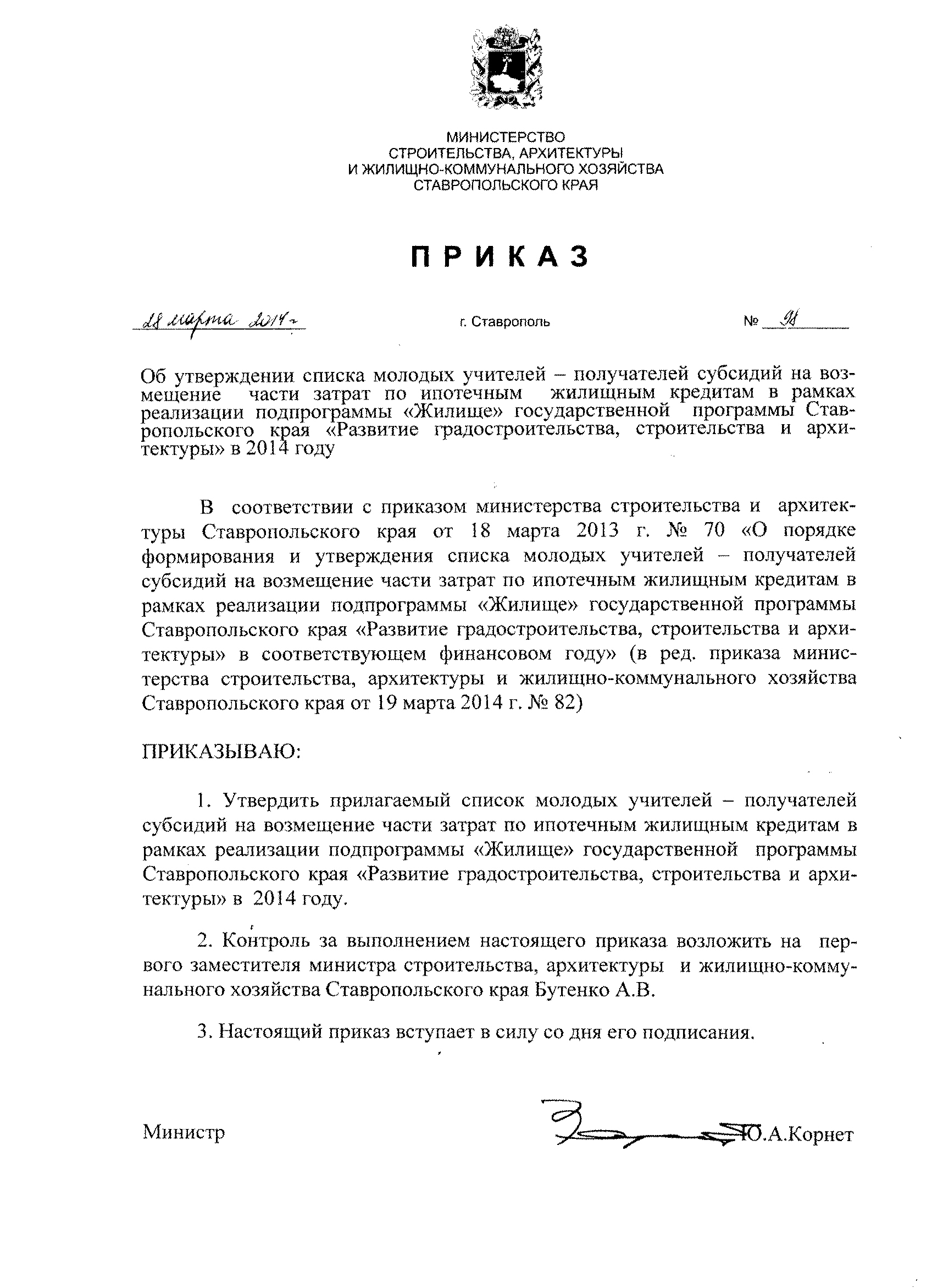 Приказ министерства строительства, архитектуры и жилищно-коммунального хозяйства Ставропольского края от 28 марта 2014 г. № 98 "Об утверждении списка молодых учителей - получателей субсидий на возмещение затрат по ипотечным жилищным кредитам в рамках реализации подпрограммы "Жилище" государственной программы Ставропольского края "Развитие градостроительства, строительста и архитектуры" в 2014 году.скачать