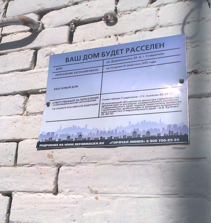 Информационные таблички14 Октября 2014 Министерством строительства и жилищно-коммунального хозяйства Российской Федерации принято решение по размещению на каждом доме, подлежащем переселению, информационной таблички, содержащей информацию о сроках и адресе переселения граждан и лицах, ответственных на территории муниципального образования за реализацию программ переселения, телефонах и адресе официального сайта государственной корпорации – Фонда содействия реформированию жилищно-коммунального хозяйства www.reformagkh.ru с подробной информацией о переселении граждан.