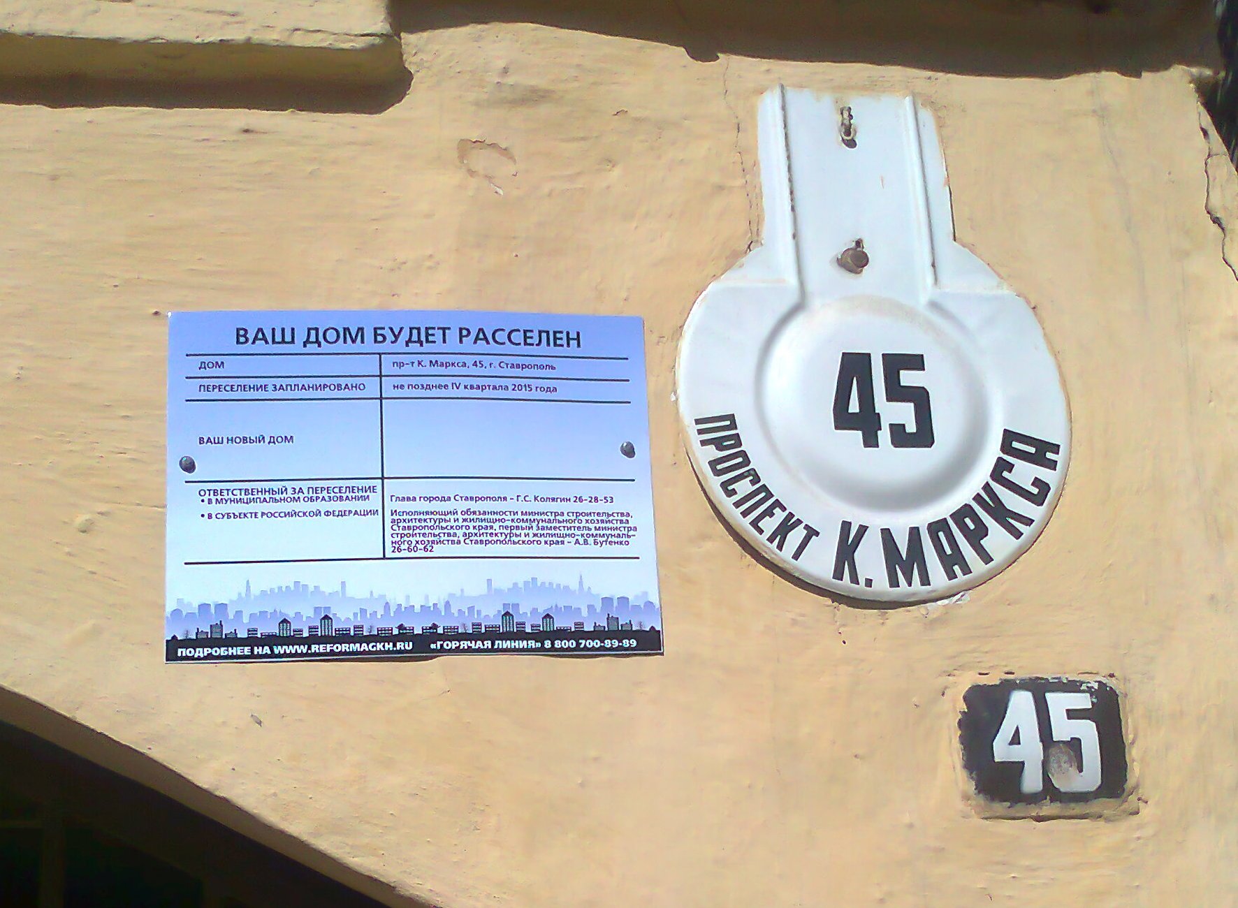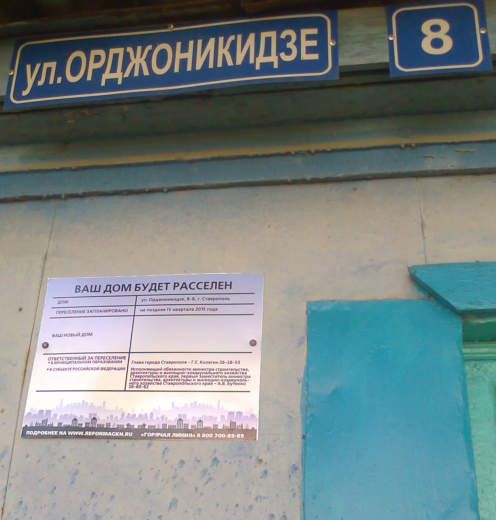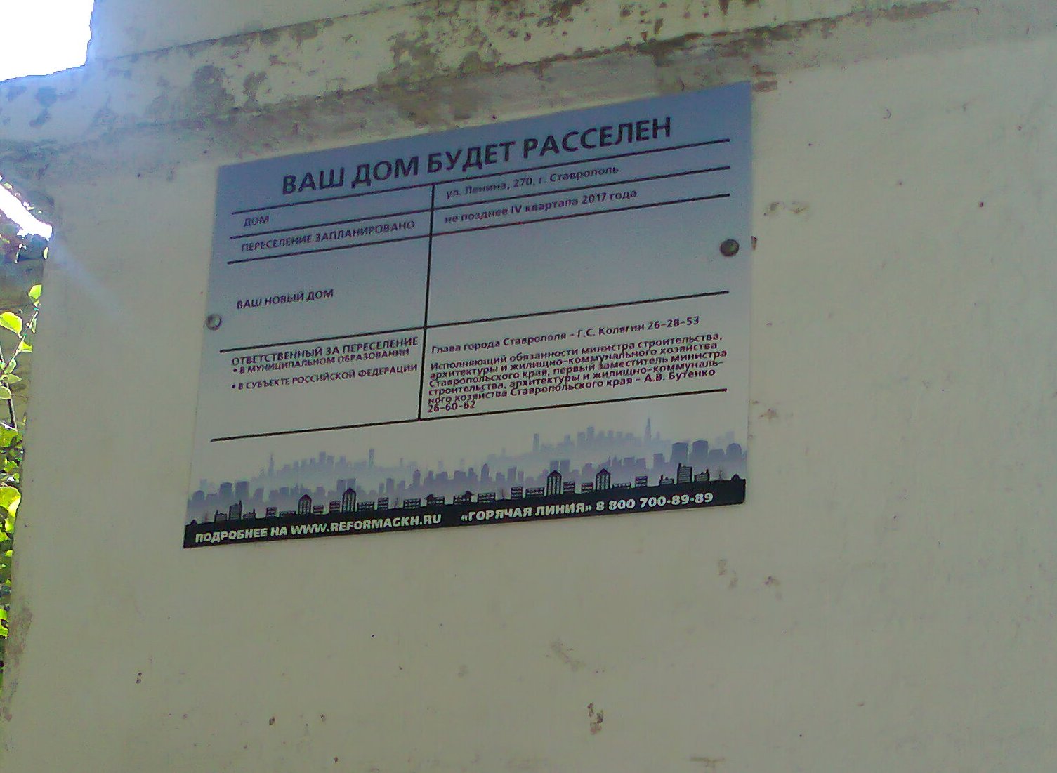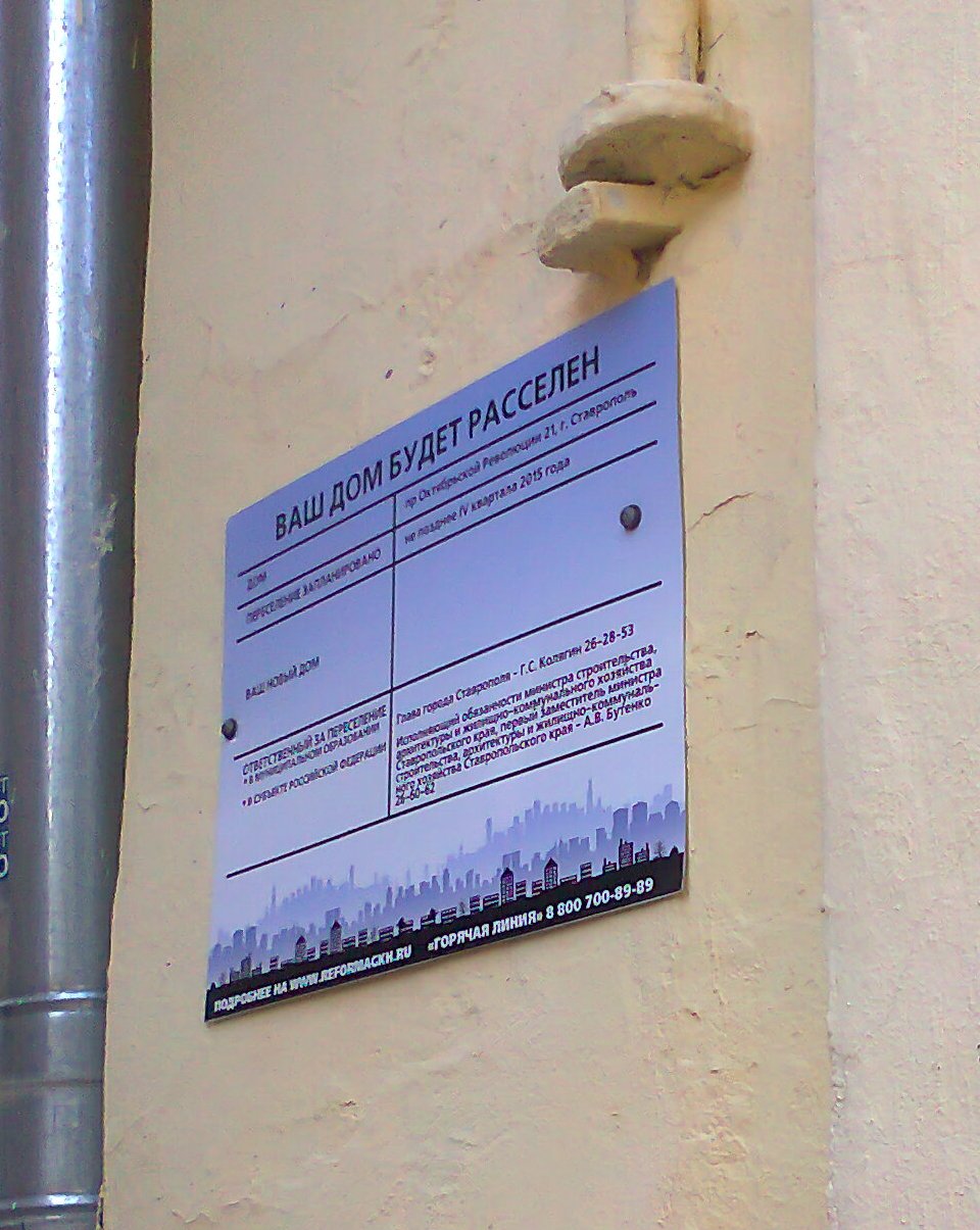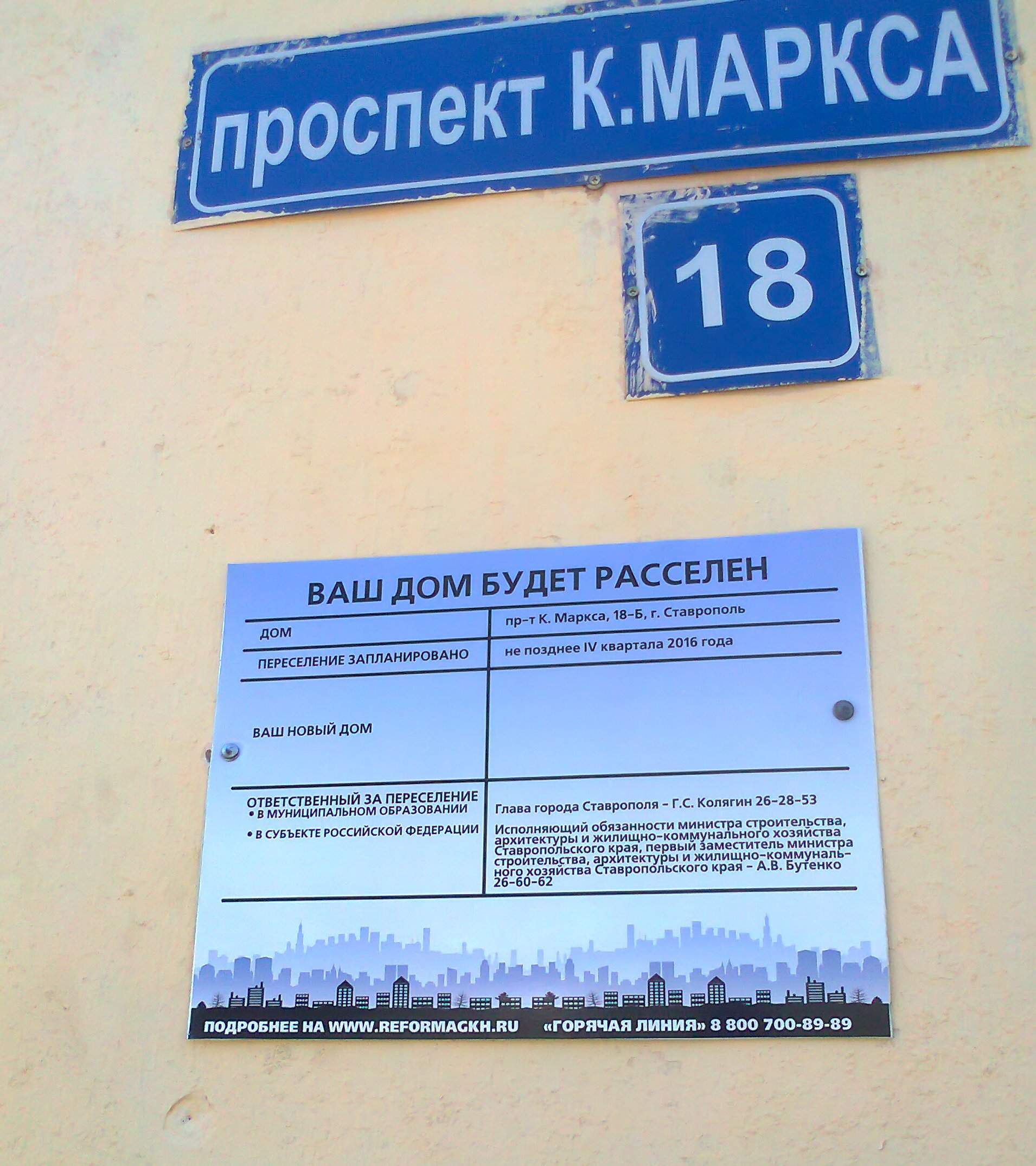 Министерством строительства и жилищно-коммунального хозяйства Российской Федерации принято решение по размещению на каждом доме, подлежащем переселению, информационной таблички, содержащей информацию о сроках и адресе переселения граждан, лицах, ответственных на территории муниципального образования за реализацию программ переселения, телефонах, а также адреса сайта государственной корпорации – Фонда содействия реформированию жилищно-коммунального хозяйства с подробной информацией о переселении граждан www.reformagkh.ru и телефона горячей линии Фонда 8-800-700-89-89: